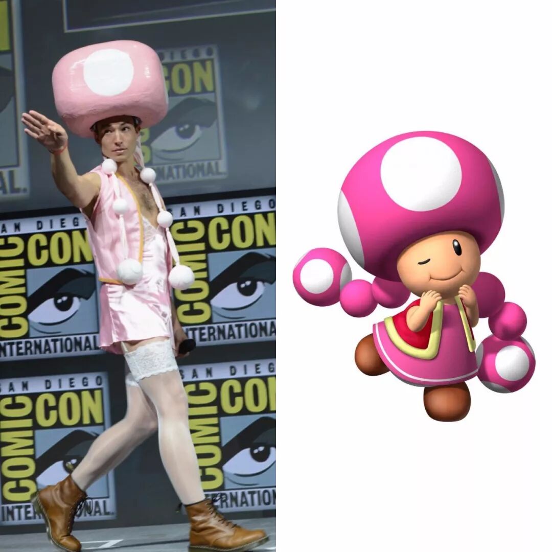 他扮的是任天堂的招牌角色蘑菇少女奇诺比可——没错,还不是普通的蘑菇人,得是蘑菇少女他才开心。