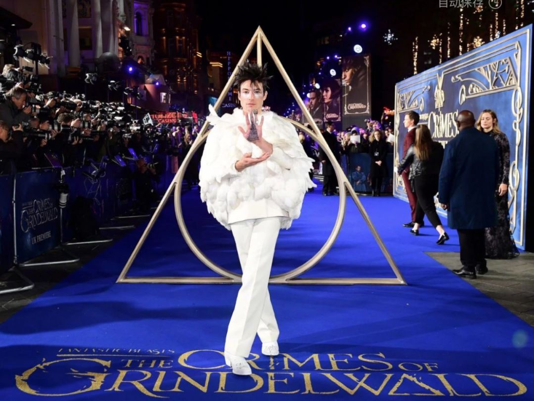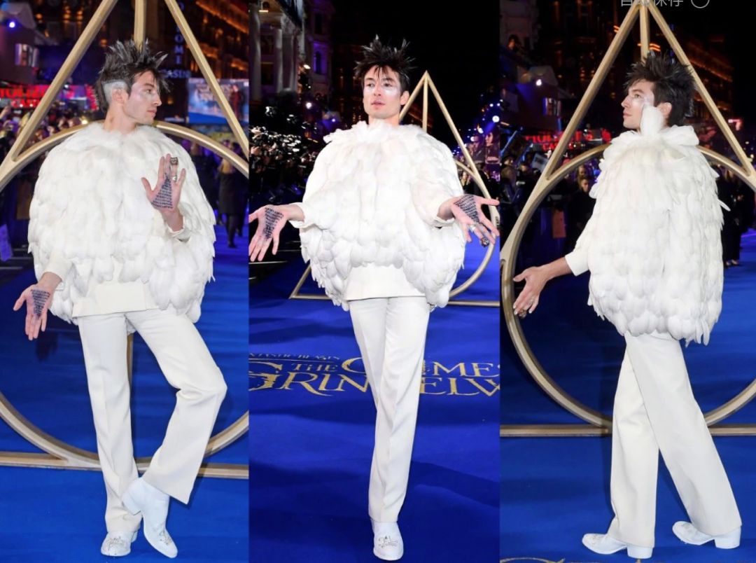 《神奇动物》的英国首映式上,他穿了一件白色羽毛外套,整个人像是从九又四分之三站台刚刚穿越过来。