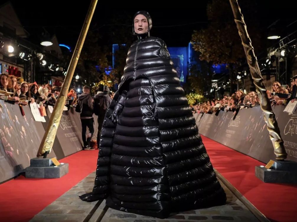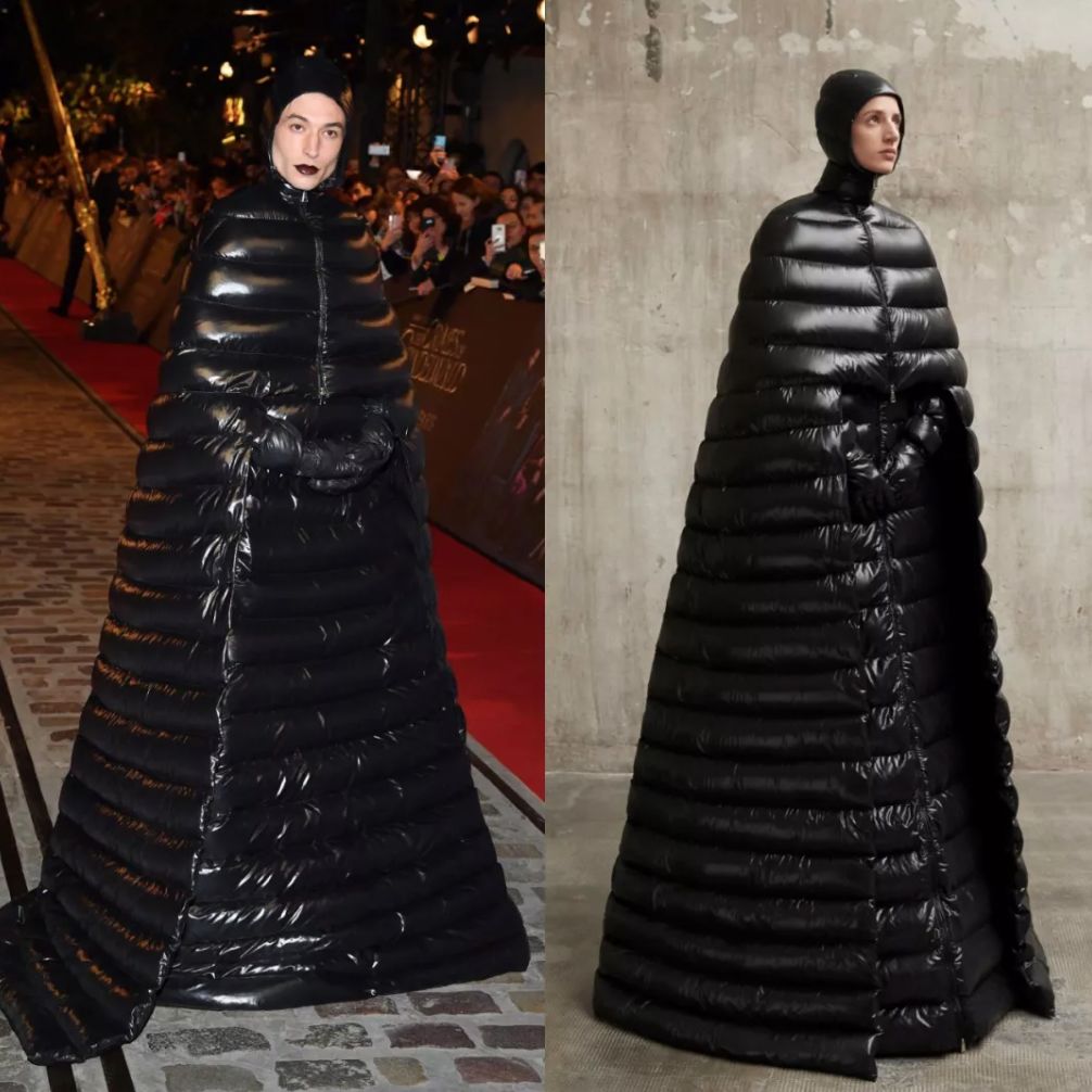 这件羽绒服是 Valentino 的设计师和 Moncler 跨界合作的款式,它的长度堪比是华丽的晚礼服,再加上像是连身泳帽的设计,庄严肃穆,十分难驾驭,一度被网友们誉为最难搭配挑战的“死亡单品”。
