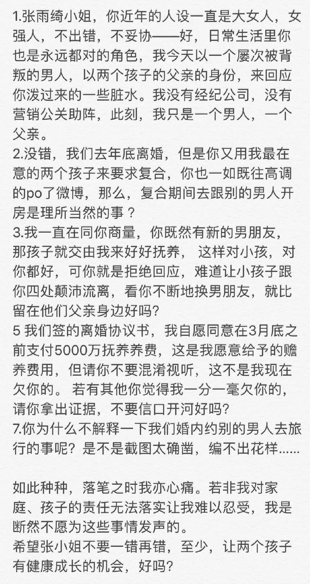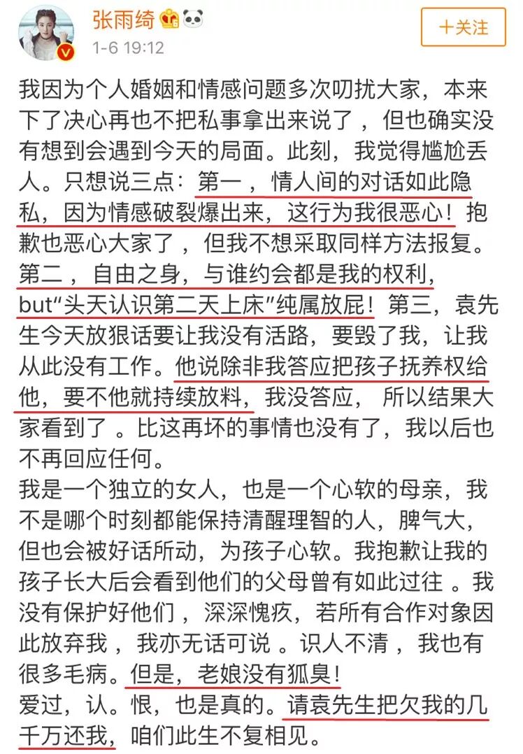 很明显,老袁被张雨绮的离婚精准打击之后,在拉扯中打不出别的厉害的牌了,只好使出了这种爆微信的下三滥的招术,如果是想抢回孩子,不出抚养费,那就真的有点下作了。