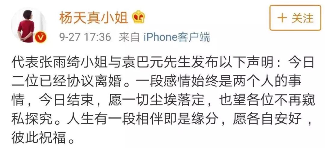 ▲简单回顾一下第一部的剧情:2018年9月24日,警察接到袁巴元的报警,说是被妻子张雨绮持刀划伤。三天后(9月27日),张雨绮就火速和袁巴元离婚,并通过经理人杨天真的微博发布了离婚声明。