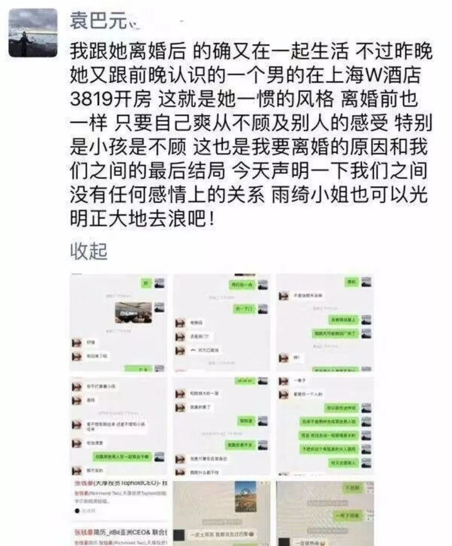 然后昨天晚上,前夫老袁再放出“私密微信对话大公开,狐臭荡女开房3819”狗血剧情。