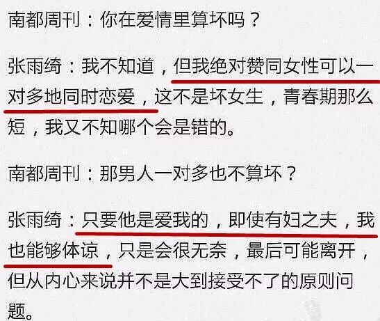 ▲张雨绮曾经在接受采访时说过她是同意一对多同时恋爱的。
