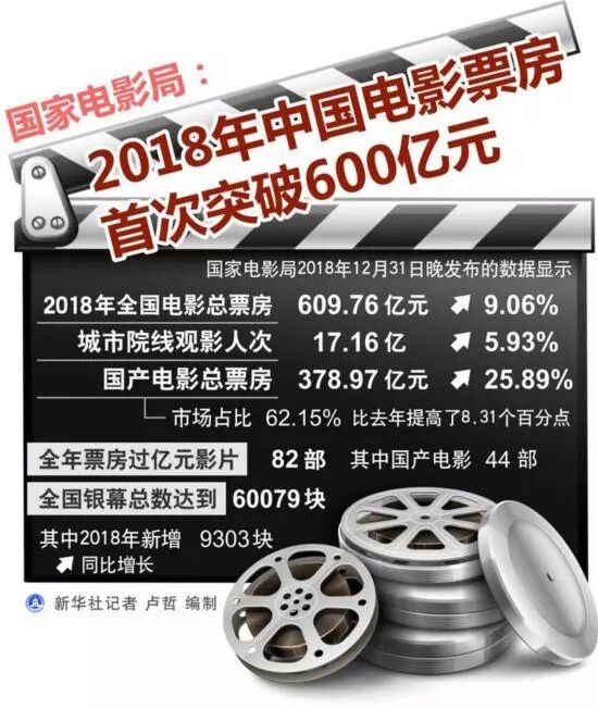 据国家电影局跨年夜发布的数据,2018年全国电影总票房为609.76亿元,如愿冲破600亿的“小目标”;其中国产影片票房378.97亿元,占比超过六成;全国新增银幕9303块,总数达60079块,已居世界首位;而这一年,仅在城市院线看过电影的就有17.16亿人次。