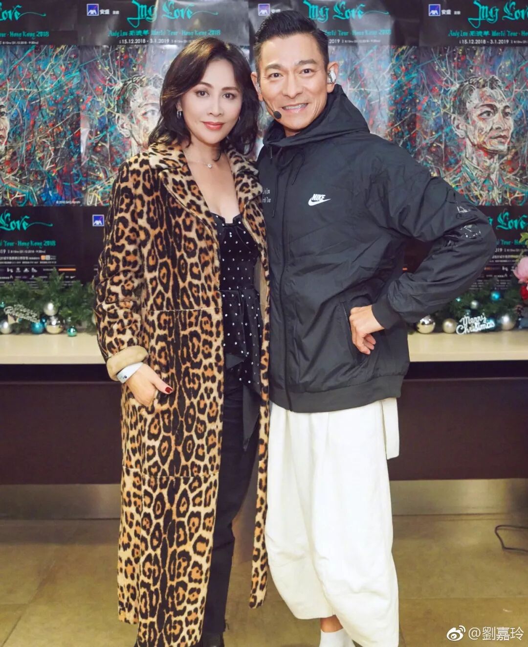 穿着豹纹的刘嘉玲小姐幸运地在第六场去探华仔的班,靠的也是蛮近的!和前几天在向华强先生七十大寿上刘嘉玲向刘德华献花那张照片相映成趣: