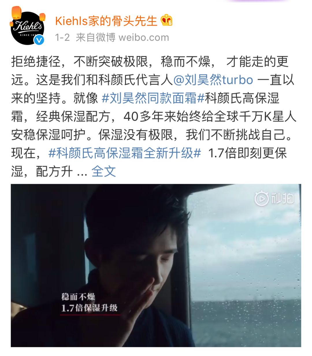 那天在微博上看到刘昊然为科颜氏全新升级的高保湿霜拍的一条广告: