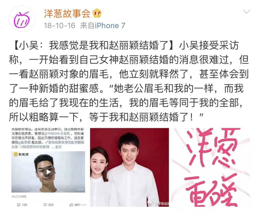 还有去年导致微博瘫痪“官宣”的冯绍峰和赵丽颖的新婚照,因冯绍峰的眉毛和小吴撞型而被调侃。