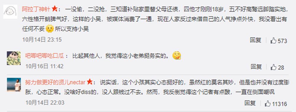 相比之下,同样是草根出生的小吴要幸运许多,从开始就以讨喜亲近的形象获得了大家的理解。可再美好的事儿,总能有人找到令TA不悦的一面。