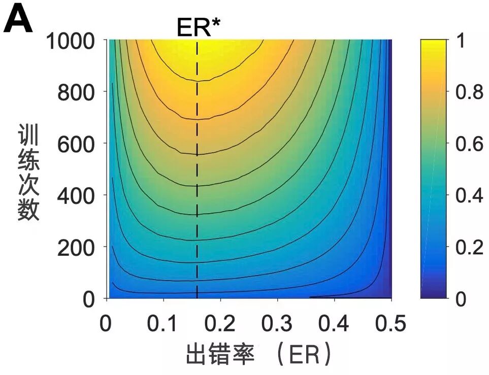 我们来看看模拟实验的结果。下面这是一张等值曲线图,说的是判断出错率和AI训练效率的关系——