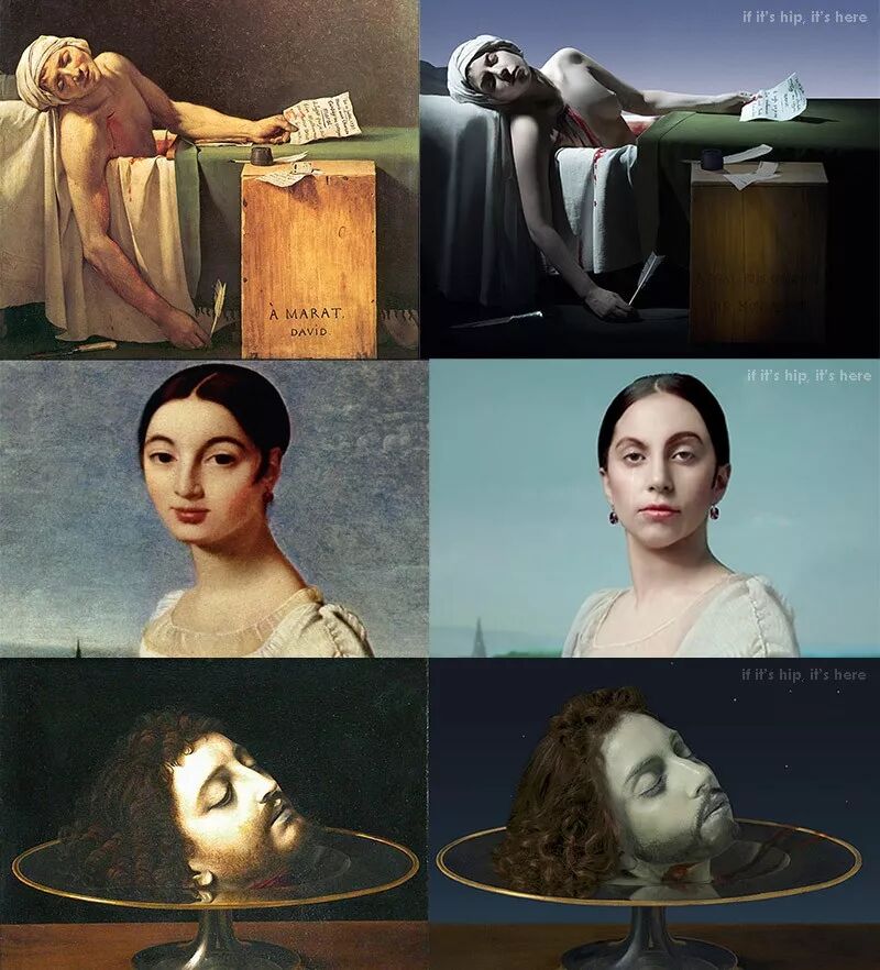 背景拼贴了 Sandro Botticelli 的《维纳斯的诞生》以及 Giovanni Lorenzo Bernini的《阿波罗和达芙妮》两幅名画。