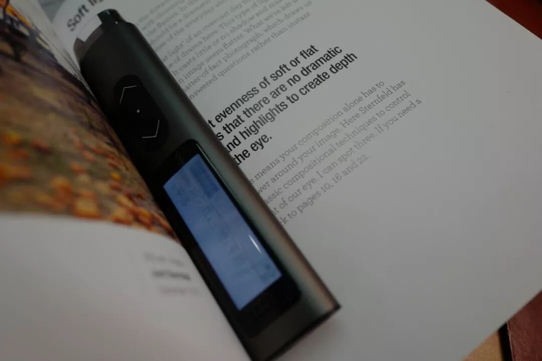 如何使用呢?在阅读的过程中遇到需要查词的情况,竖向落笔,贴合纸面,这时候会触发笔内部的 Led 灯,白色灯光会照亮你需要扫描的位置,然后横向移动,抬起即可成功取词,然后通过我刚才提到的左右翻页键和单击或双击操作,获得你想要的查询结果。