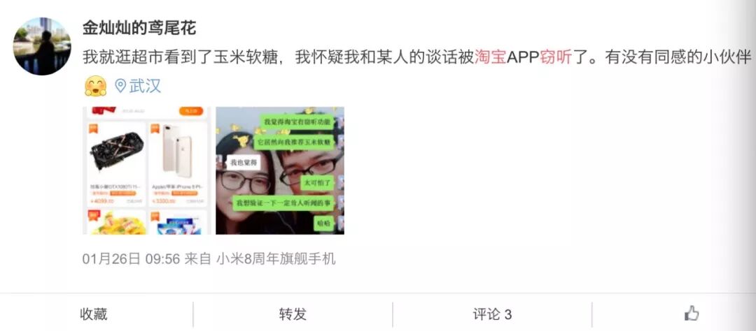有人转发并严肃表示:淘宝确实有监听功能。以“淘宝+监听”为关键词来搜索微博的话,会发现很多人有相同的经历。有人在家里说了一句“没有筷子了”,隔天淘宝就给推送了好多筷子。