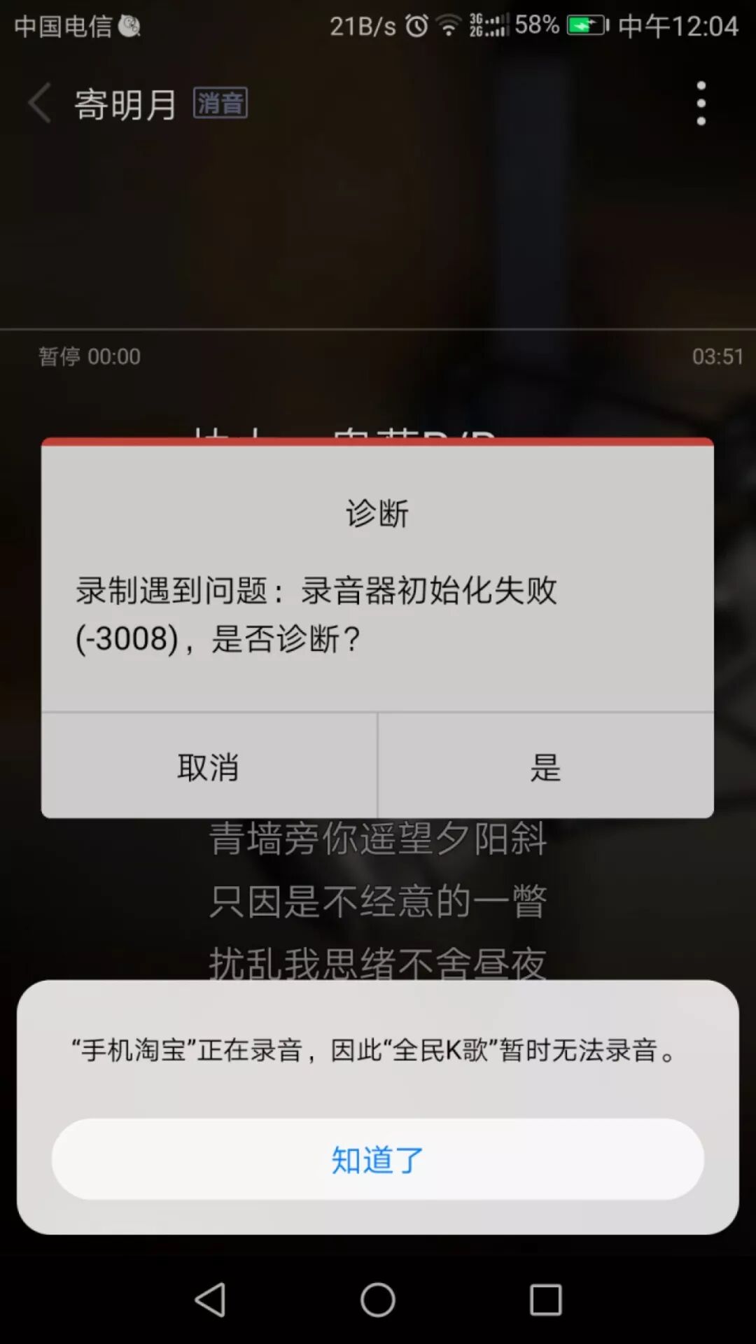 如果还嫌锤不够硬,那就再来些别的,有人晒出一张截图,说自己在用全民K歌录音的时候,跳出一个提示说手机淘宝正在录音,而当时的她根本没有在用淘宝。