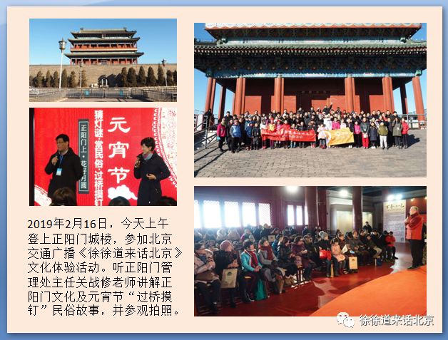 2019年2月16日,春节长假后的第一个周末,北京交通广播《徐徐道来话北京》栏目组,和正阳门管理处合作,举办了“敬老爱幼登正阳,过桥摸钉庆元宵”活动,本市中小学生和六十岁以上老人免费登上正阳门,观看正阳门城楼正在举办的《阿呆的厨房--京津冀灶王民俗文化展》,到正阳门城楼过大年。