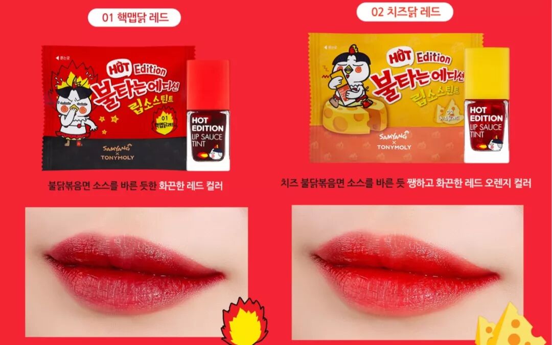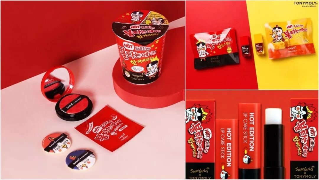 韩国著名的三养火鸡面,也携手彩妆品牌 Tony Moly 推出了一系列辣鸡彩妆,不只把气垫放进杯面里,还把唇釉包装得像辣椒酱。