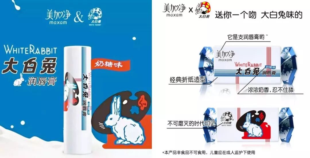还有同为国货之光的大白兔和美加净,也跨界合作推出了联名款唇膏,外包装做成了经典的大白兔奶糖。