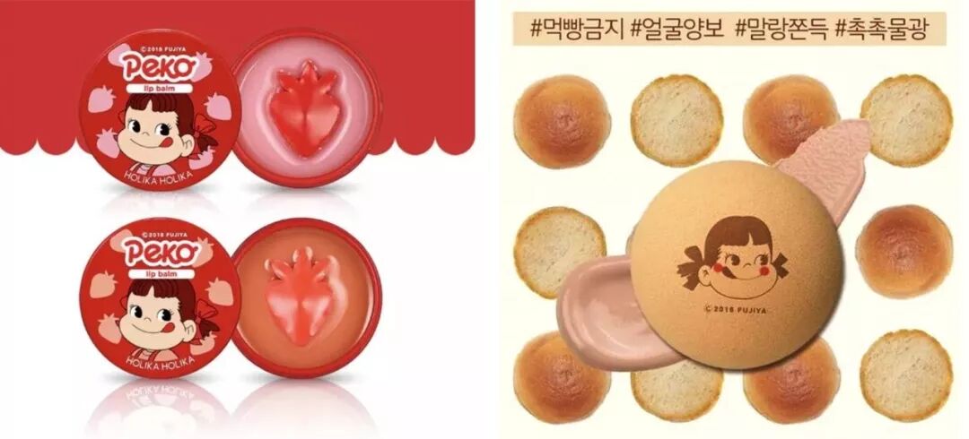 不二家也和彩妆品牌 Holika Holika 跨界联名,推出了包括气垫、口红、唇膏和护手霜在内的一整套美妆。