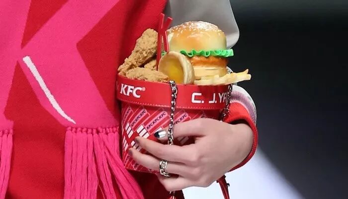 比如肯德基在上海时装周上,曾与设计师 C.J.YAO 合作推出过一款 Hope Fully 全家桶包包,远看完全可以以假乱真。