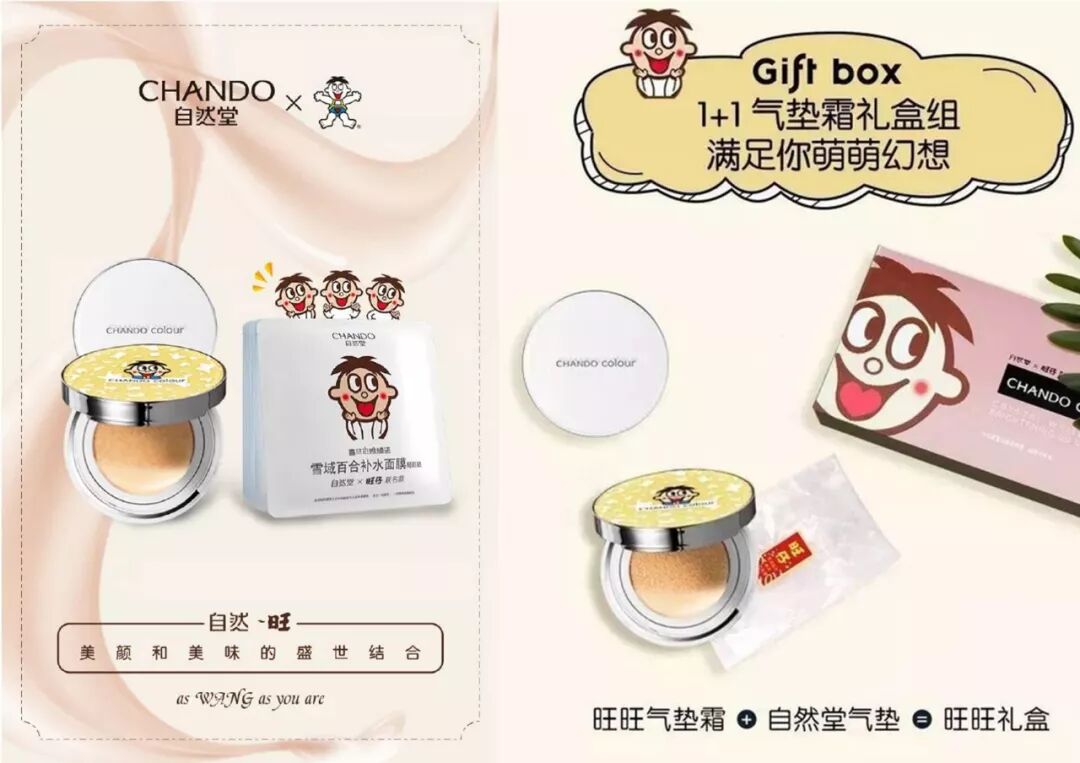 旺旺除了跨界推出联名服饰,也携手自然堂推出过两款护肤彩妆产品,一款是旺旺雪饼状的气垫,另一款是面膜。