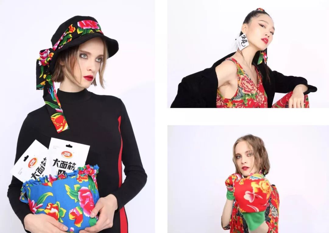 此前,卫龙还推出过一系列乡村碎花风格的连体裤、披肩、帽子和耳饰等时尚单品,但画风,就更一言难尽了。