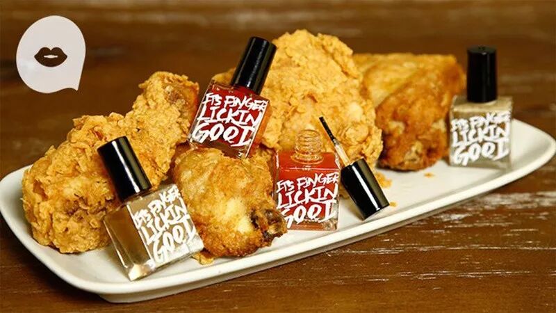 其中这款炸鸡味指甲油有原味和香辣味两种味道,据说上手5分钟后不仅可以尽情吸吮,干透后还会散发出浓浓的炸鸡味,可能是鼓励大家都爱上吃手指吧。