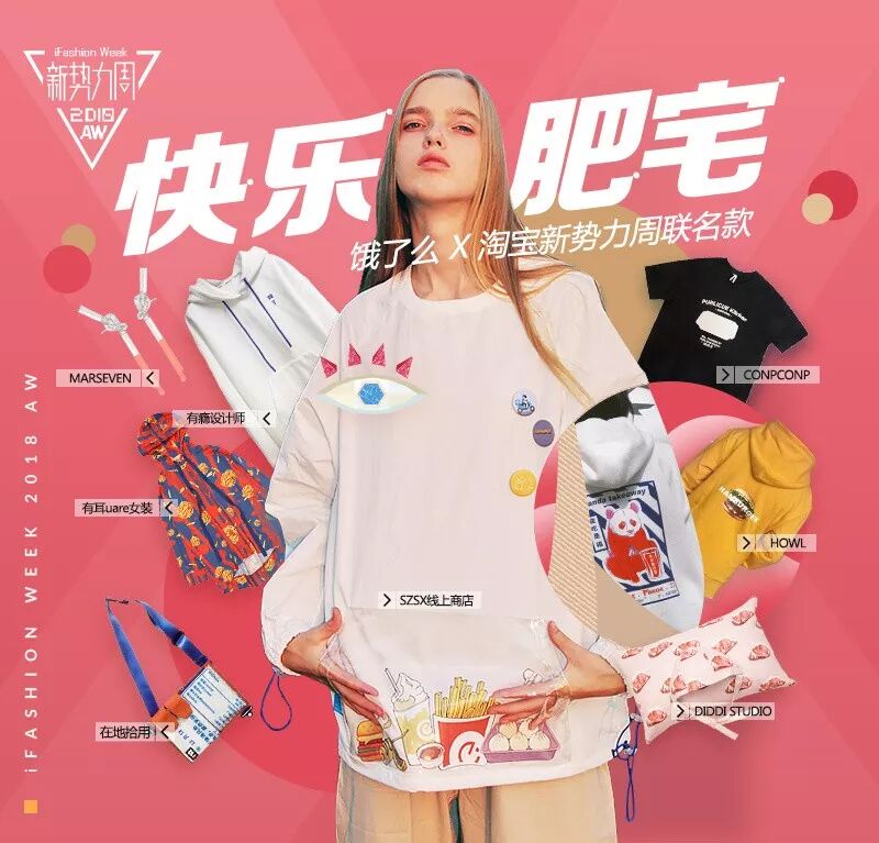 餐饮界的国民 App 饿了么,在去年天猫的新势力周时期,曾携手8位设计师,以「快乐肥宅」为主题进行了一系列跨界创作。