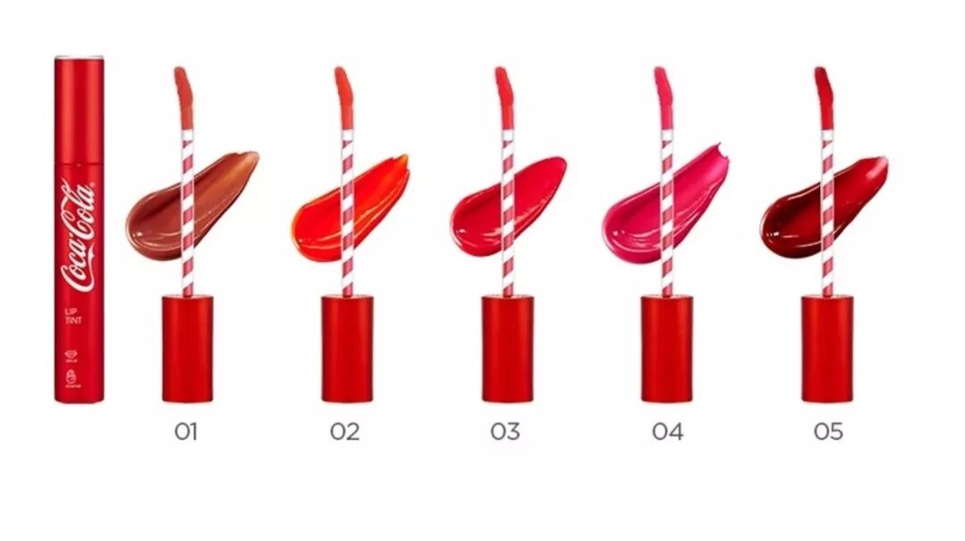 在前段时间可口可乐与 The Face Shop 跨界合作系列中,除了气垫粉底、眼影,就还有5种颜色的口红、唇釉和染唇液。