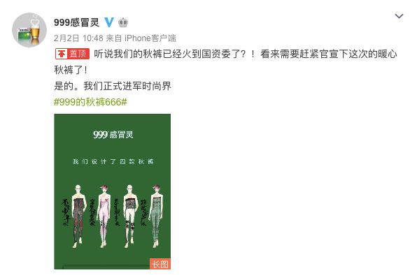 原因是因为2月2日当天,999感冒灵通过官方微博宣布“正式进军时尚界”,并发布了四款名为不凉少年版、穿久保灵版、养生朋克版和跪舔客户版的高腰【秋裤】,瞬间引起全网热议。