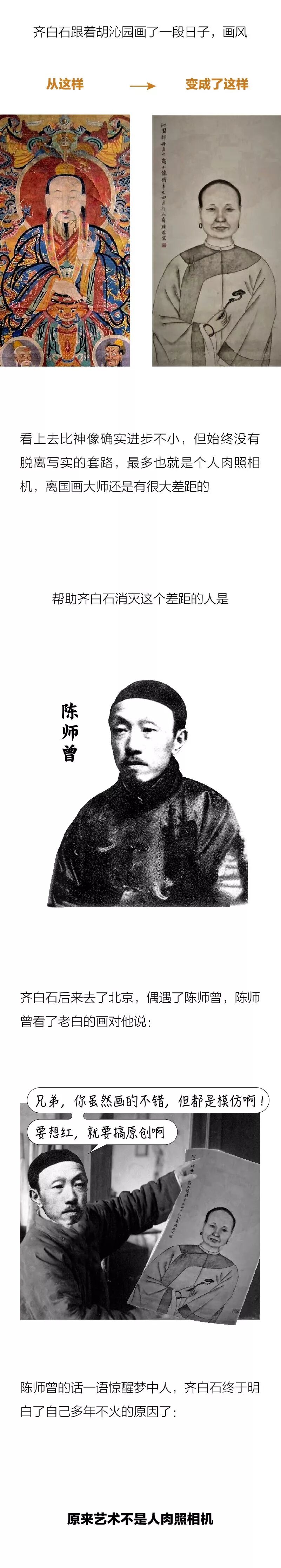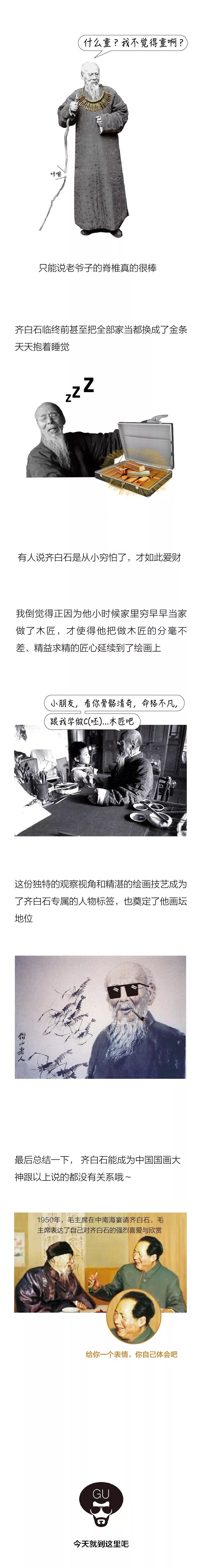 齐白石听完一脸懵逼!答道:“我只送您印章没送画啊~”毛爷爷听完手一挥,秘书恭敬的奉上了一幅用金绫装裱的画。画里是一棵茂盛的李子树下面还有头牛,齐白石一看脸色都变了,大惊道:“唉呀妈呀!这是我练习的一副废稿!顺手拿来包印章了!”齐白石连连道歉,并对毛爷爷说:“您要是喜欢,我回去马上重画一副给您送来~”