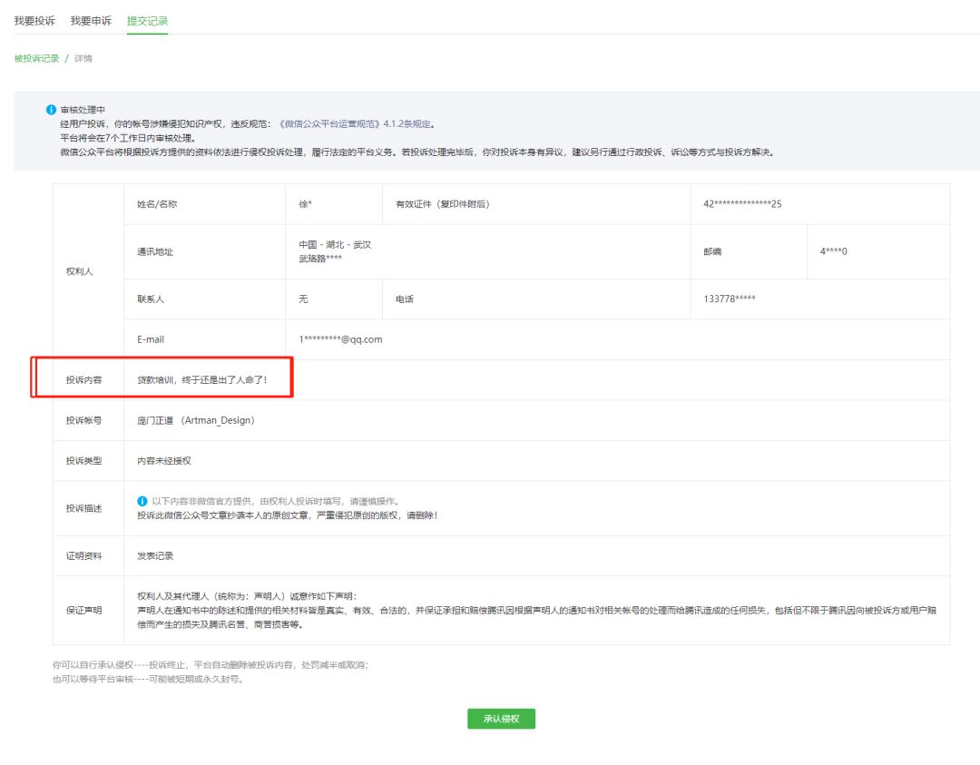 当然是关于这篇文章的,不过让我比较意外的是,投诉理由说的是,未授权内容。