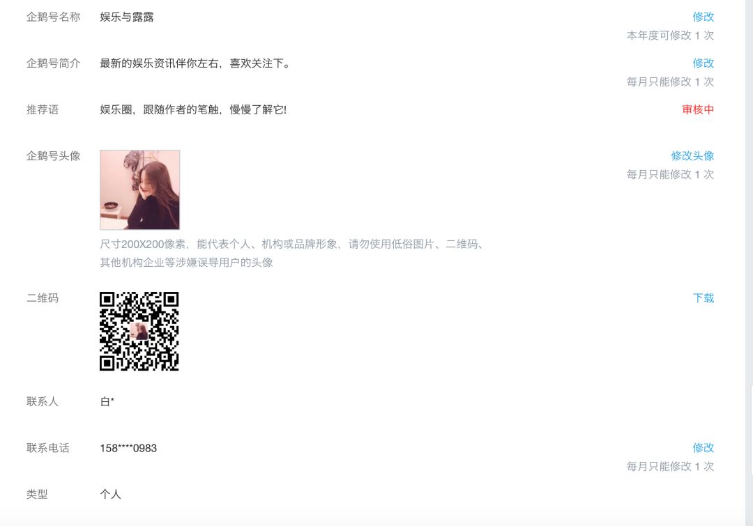企鹅号的名称已从「三表龙门阵」变为「娱乐与露露」,阿表帅气的东北炮子头像也被换成了低眉顺眼的绿茶女孩。其他的所有主体信息也都被更换了。