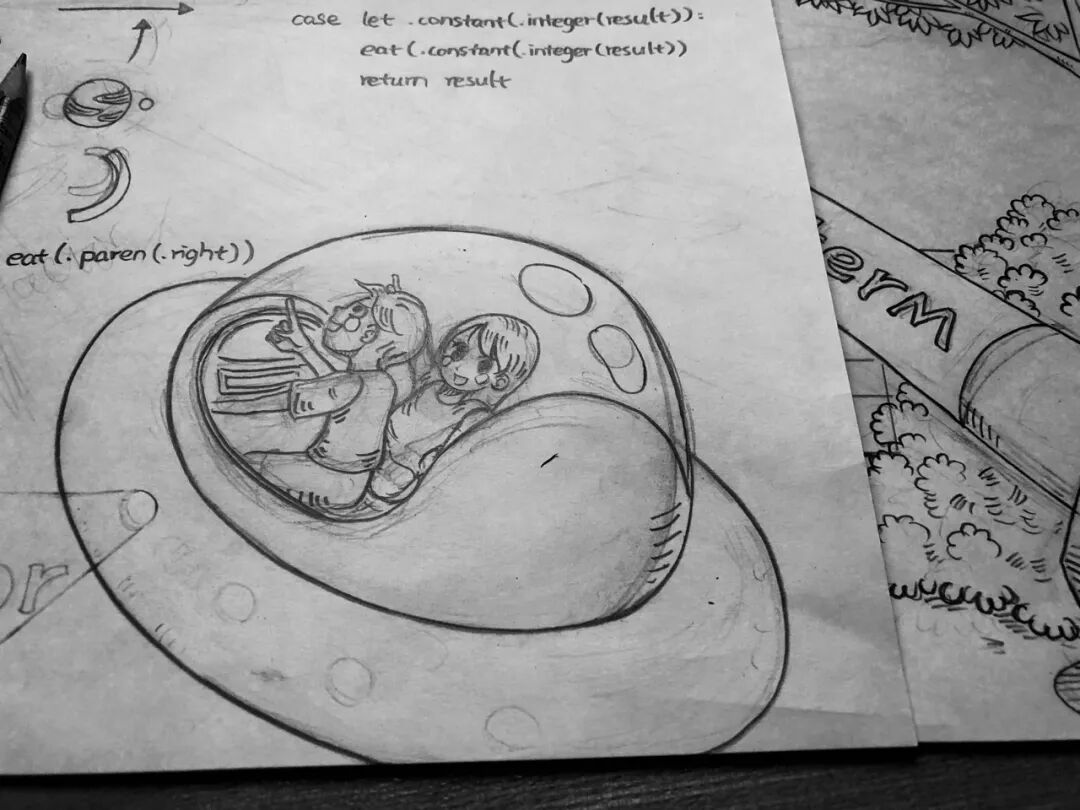 这些画作的作者就是我昨天介绍的 iOS 高手课的出品人戴铭,另外,这些画也不是画着玩的,而是他在 2018 年 Swift 大会演讲的幻灯片。也就是说,他的每一页幻灯片,都是要画好几幅画的……从手绘、扫描、后期处理,到最后完成 keynote,感觉是在创造一个艺术品,而不是演讲稿。