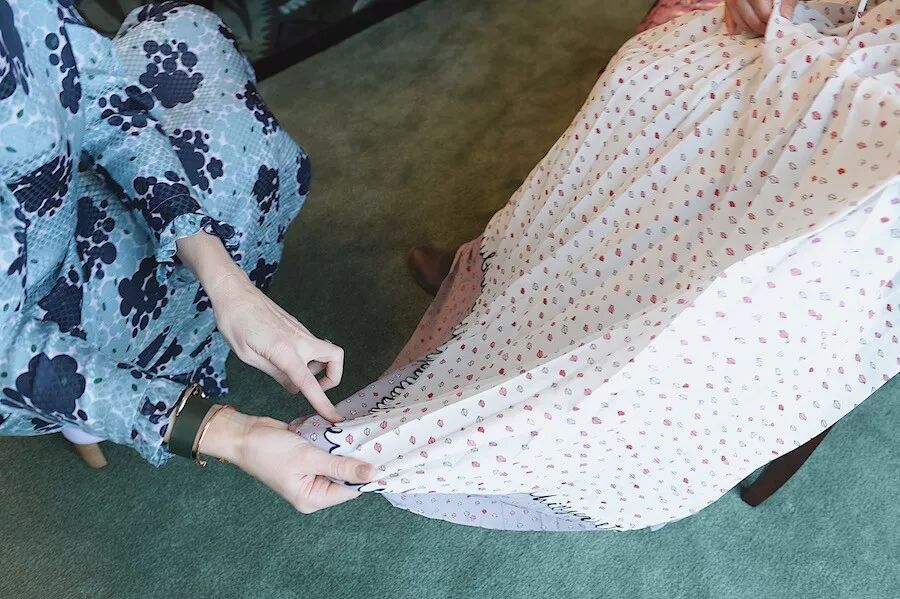 采访当日,我注意到 Nicola 团队随行同事的裙装暗藏玄机:这些远远看上去整齐有序的糖果色系波点印花,其实由无数嘴唇组成。