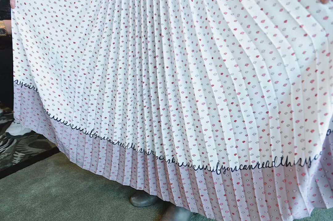 而在裙下摆的色界分区之交汇处,用手写字体写着这样一句话 ——“如果能看清这些字,你就靠得太近了”。