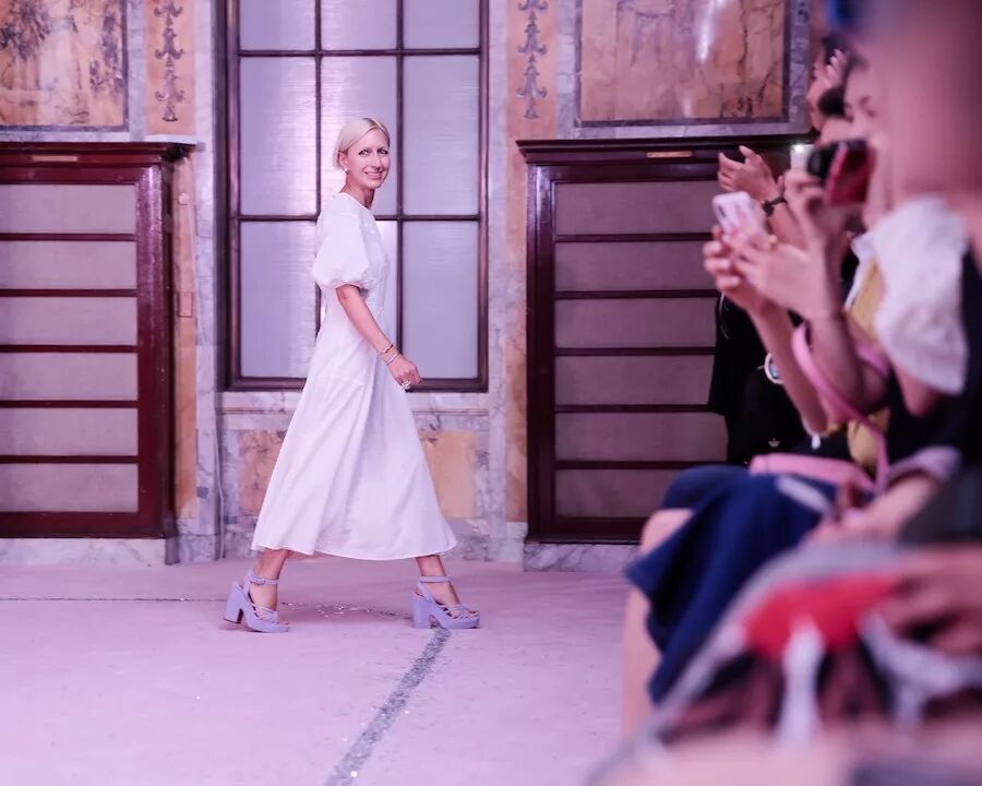 当天的 Nicola Glass 身穿一身典雅的蓝色印花裙混搭粉紫色皮靴,一头率性的浅金色短发恰到好处地中和着浪漫鲜丽的女性形象。