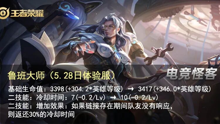 鲁班大师基础生命值小幅增加,满级大约比之前多出650点生命值左右。此外,二技能链接期间,如果队友没有使用交互,那么回会返还30%的技能冷却时间,这一点还是很不错的,增加了鲁班大师二技能的容错率。
