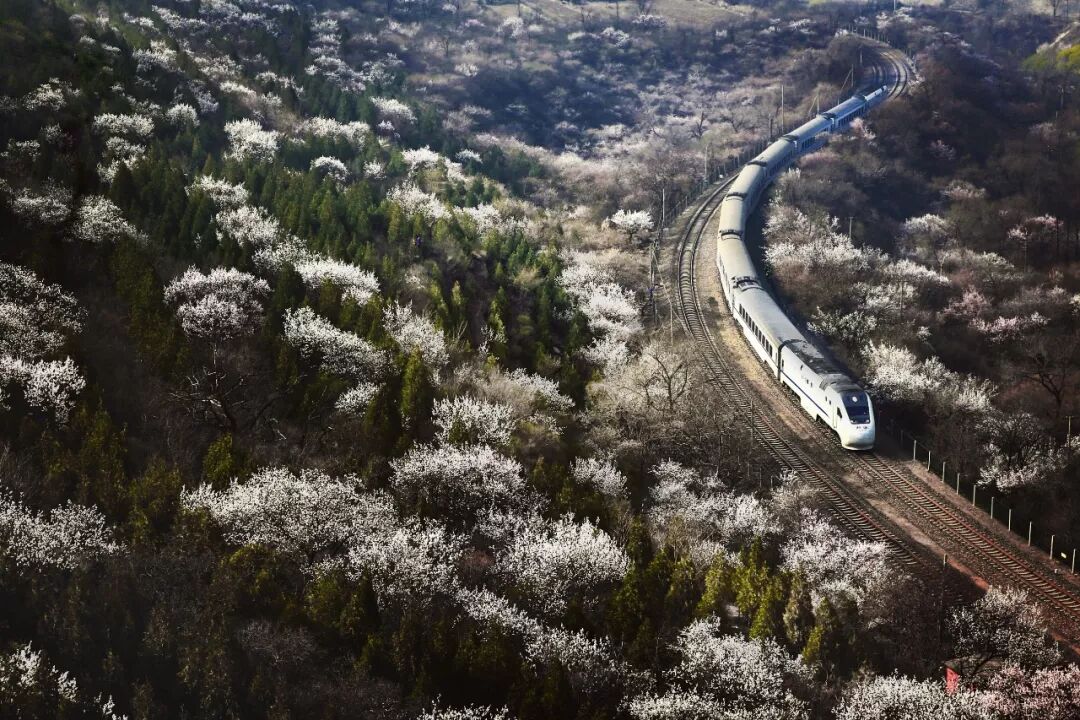 2018-04-01,北京。春暖花开的四月,鲜花盛开的长城脚下,”开往春天的火车”定格在镜头里。作者:黎邦名