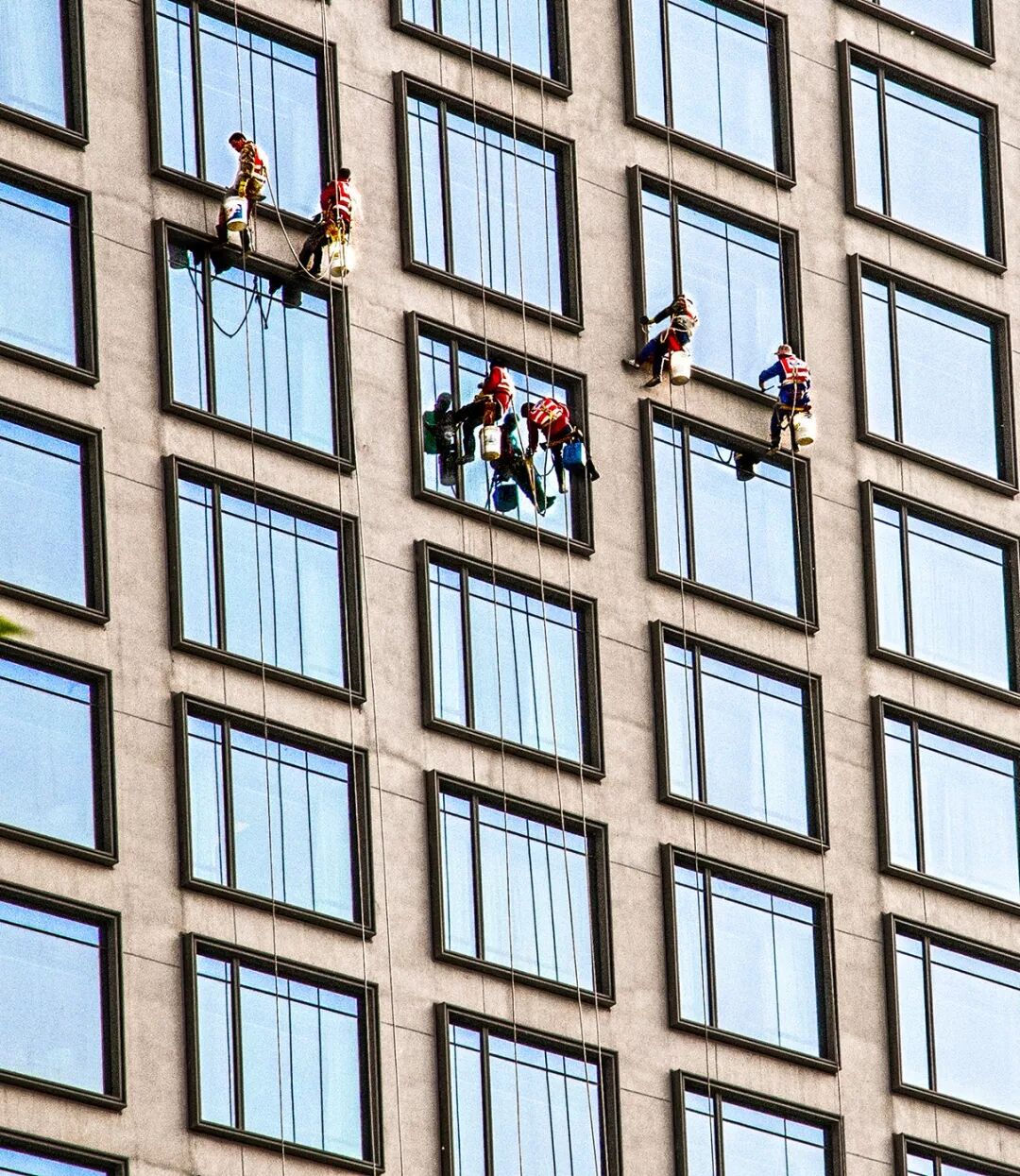 2018-04-18,山东济南。几十层高楼外的“城市美容师”。作者:程普麟