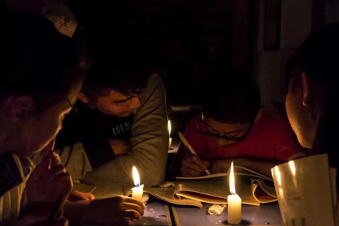 2018-08-02,甘肃积石山。支教老师在停电后点燃蜡烛给孩子辅导功课。作者:句号