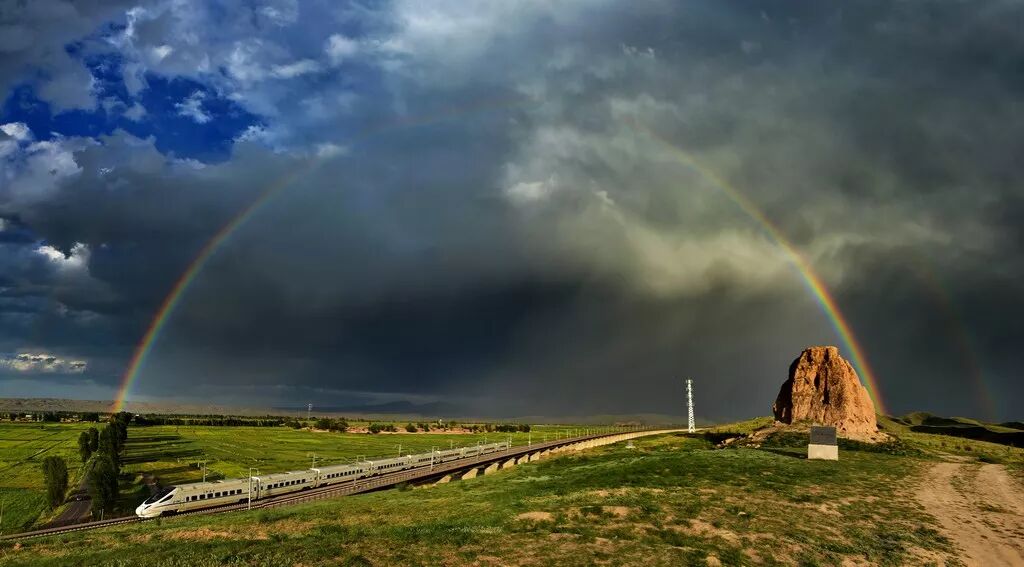 2018-08-10,甘肃民乐。丝路古道边,高铁从古烽燧旁边飞驰而过。作者:雪山之子