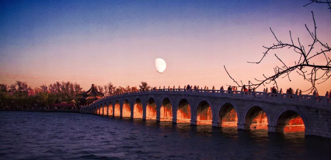 2018-11-18,北京颐和园。西沉的太阳,初升的月亮,在十七孔桥相会了。作者:小巷