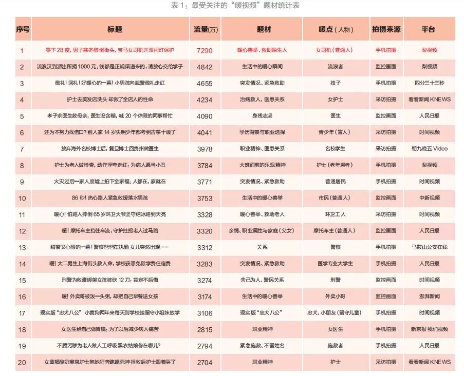 中国人民大学新闻学院教授、博士生导师,中宣部媒体融合专家组成员宋建武在发布《2018暖视频白皮书》时阐述,暖视频内容有以下几个特征:与公众的认知有鲜明反差的事件震撼人心的程度相对较大,如被“标签化”形象、弱势群体的反差行为;特殊职业、特殊群体易引起公众恻隐之心,如警察、医生等;社会题材易引起公众关注,如“警民关系”“ 医患关系”等易引发社会热点的话题;生活中的暖心善举成最大“温暖之歌”,暖其实来于身边。