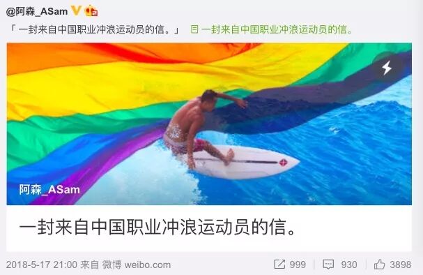 中国职业冲浪运动员,前国家冲浪队队长许景森(@阿森_ASam )于2018年5月17日(国际不再恐同日)当天,在微博发布图文公开出柜,表示将参加今年八月在巴黎举行的世界同性恋运动会,并将担任世同会全球形象大使。