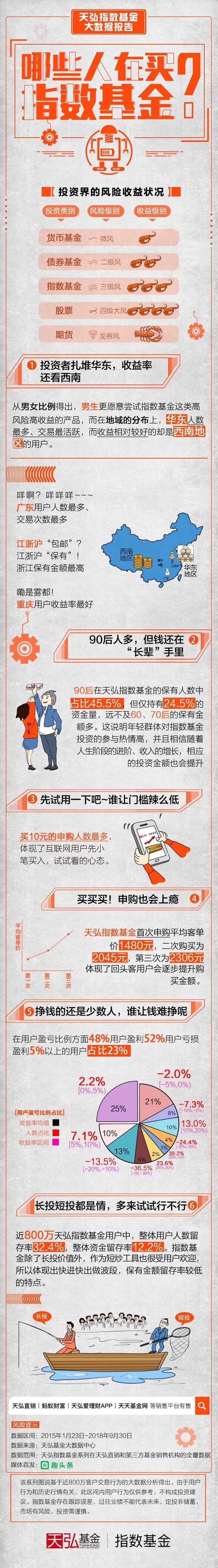时间又到新旧交替之际,对基金数据盘点就成了一些基金公司的功课。为此,已经运作三年多的天弘指数基金也发布了2018年天弘指数基金大数据报告图说,该系列图说基于800万客户交易行为的大数据分析得出。同时,也通过数据的呈现,用幽默的图说展现形式,为用户展示真实的投资者情况,科普指数基金以及站在用户角度做好投资者教育。而通过这个系列图说,投资者也可以进一步了解到天弘指数基金所具有的互联网属性与指数基金属性。