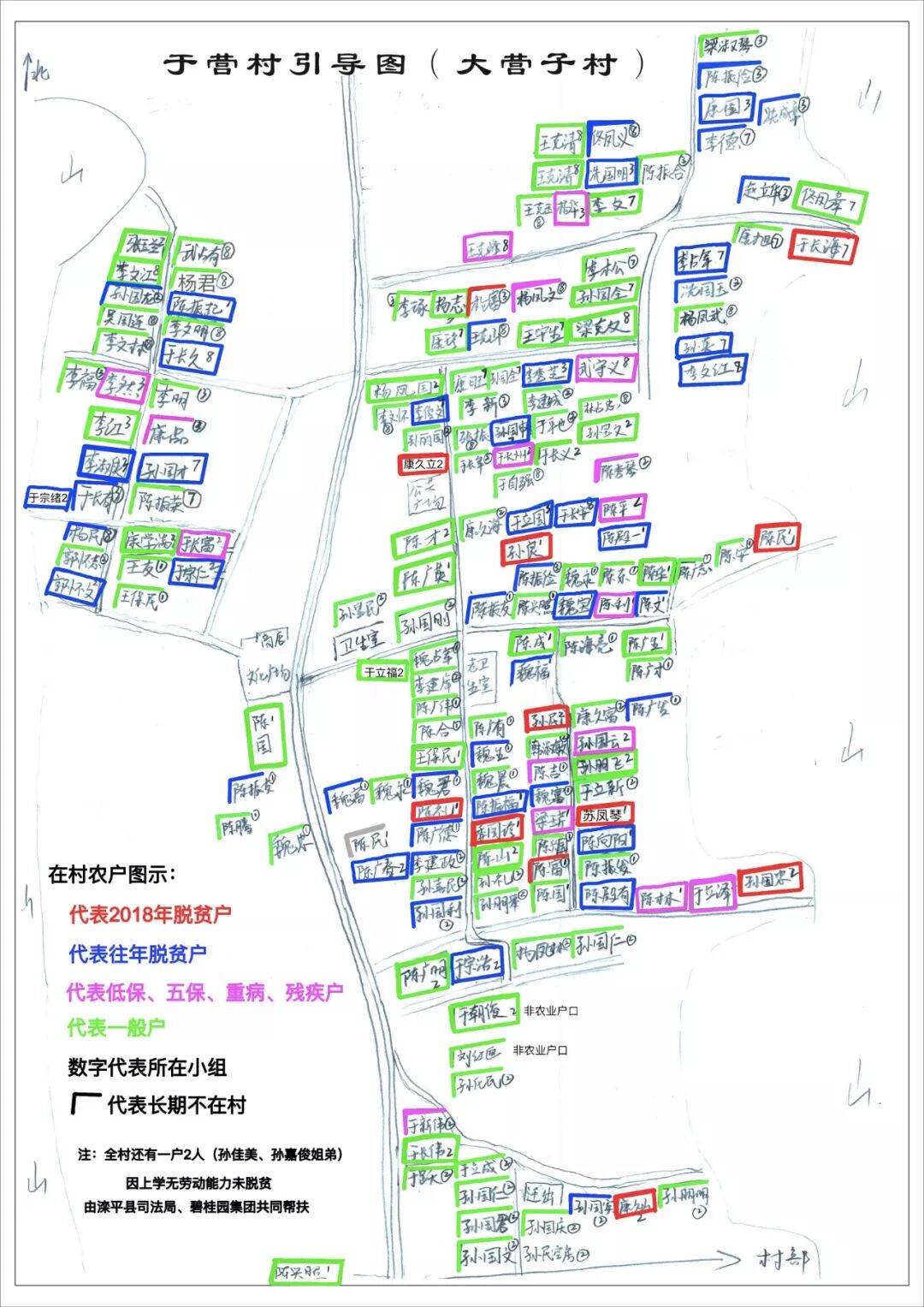 由此想到一件事。来村2个多月后,我按着走访实际情况,画了2张涵盖全村四个自然村的引导图,一一标注出农户的户主姓名,所属小组,是否常住,并将其放大,贴在村部临时办公室的黑板上。原本只是为了配合脱贫工作使用,没想到很多来办事的村民,都会驻足查看,寻找自己和亲戚的房子。有位村民看了几次后,对我说,“小吕,你这个挂职干部,看来是真想在咱村做点事“。