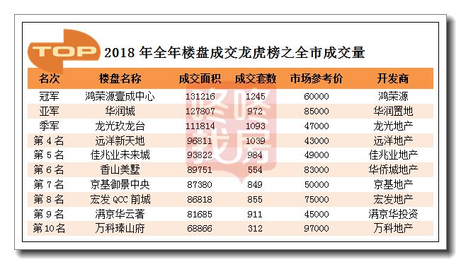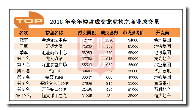 - 2018年深圳楼盘成交龙虎榜已发布,全市住宅成交面积和套数双双实现两位数增长,鸿荣源壹成中心斩获住宅成交面积和套数两项第一,这已是该项目连续第三年“霸榜”,彰显超体强大的续航能力。 商业方面,金地