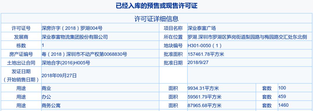 2018年9月27日,该项目获得首批单位预售资格,包括100套商业、9934.31㎡,459套办公产品,A座&B;座,59561.79㎡和1460套商务公寓,C座&D;座&E;座,面积87965.68㎡。
