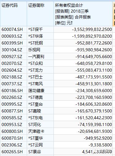 2、2018年三季报净资产为负数的`ST公司有: