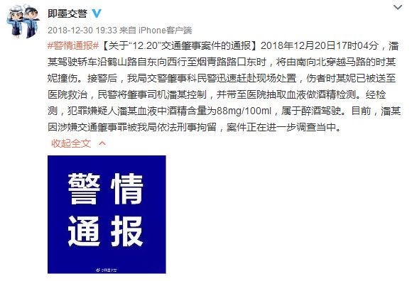 2018年12月20日17时04分,潘某驾驶轿车沿鹤山路自东向西行至烟青路路口东时,将由南向北穿越马路的时某妮撞伤。接警后,我局交警肇事科民警迅速赶赴现场处置,伤者时某妮已被送至医院救治,民警将肇事司机潘某控制,并带至医院抽取血液做酒精检测。经检测,犯罪嫌疑人潘某血液中酒精含量为88mg/100ml,属于醉酒驾驶。目前,潘某因涉嫌交通肇事罪被我局依法刑事拘留,案件正在进一步调查当中。