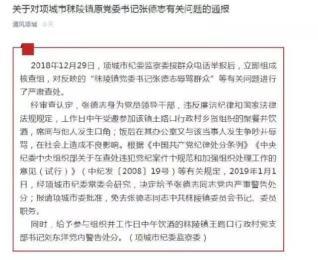 根据有关规定,2019年1月1日,经项城市纪委常委会研究,决定给予张德志同志党内严重警告处分;报请项城市委批准,免去张德志同志中共秣陵镇委员会书记、委员职务。同时,给予参与组织并工作日中午饮酒的秣陵镇王路口行政村党支部书记刘东洋党内警告处分。